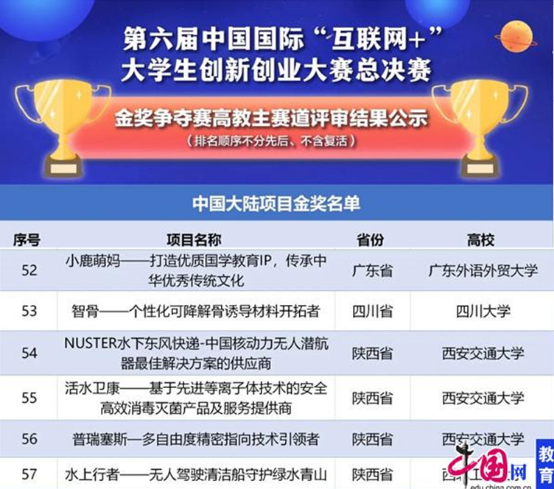 2020年11月18日-19日,第六届中国国际“互联网+”大学生创新创业大赛冠军争夺赛在广州大学城中心体育场举行,最终北京理工大学、清华大学、厦门大学等6支团队从117个国家和地区、4186所学校的147万个项目中脱颖而出,获得冠亚季军。