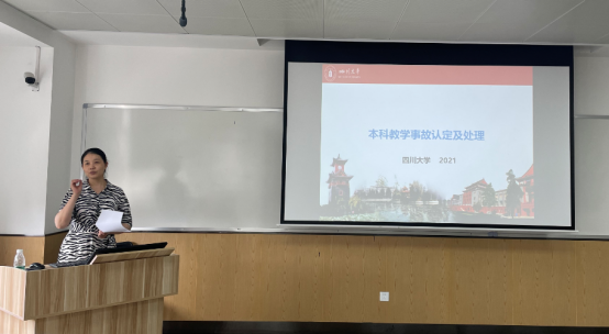 随后,学院副院长林江莉教授对学院/中心的任课老师详细讲解《四川大学本科教学事故认定及处理办法》,学校正在制定“研究生教学事故认定办法”,该办法将参考《四川大学本科教学事故认定及处理办法》,希望各位老师认真对待教学活动,严肃教学纪律。