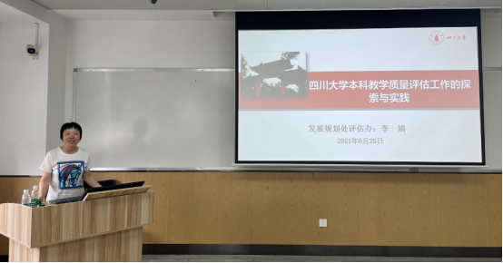 发展规划处教学质量评估与监督科李娟科长从四川大学本科教学质量评估工作的探索与实践进行讲解,从“以学为中心”高校教学质量提升的思考探讨高校教学需要怎样的质量保障体系,是提高教的质量还是学的质量?是“上了多少教学内容”还是取得“特定学习成果”?学习是“渐进式的、线性的”还是“知识框架的互动互通”?教师是主要作为“讲解者”还是“学习方法和学习环境的设计者”?这一系列的问题引起了各位老师的思考和探索。李老师详细介绍了我校五位一体质量保障体系,并且阐述为了破除期末一次性评教进行的改革,采用课程过程中及时的学生学习效果反馈评教。