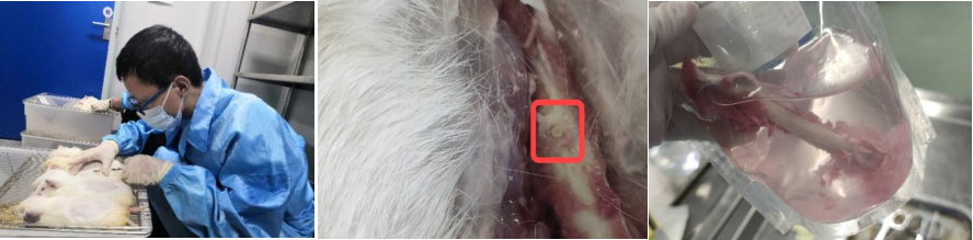 图1 实习同学进行动物实验(左图:豚鼠注射;中图和右图:兔骨取材)