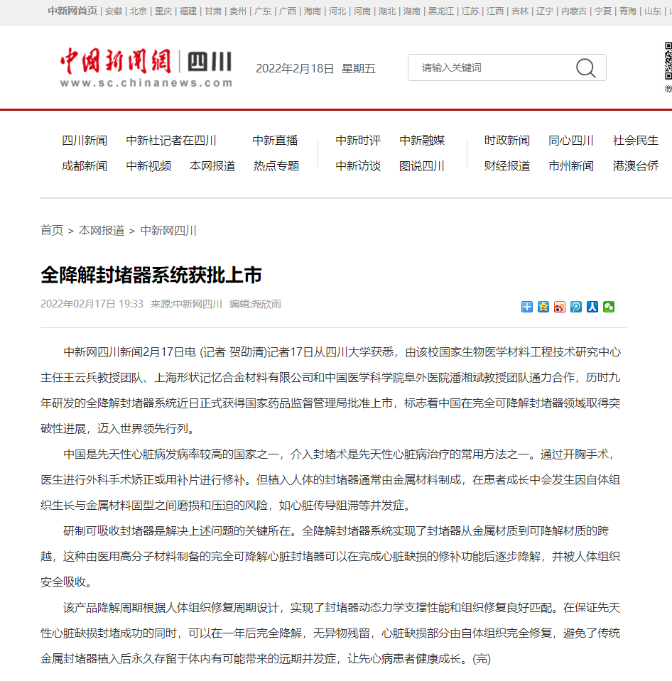 近日,四川大学国家生物医学材料工程技术研究中心主任王云兵教授团队、上海形状记忆合金材料有限公司和中国医学科学院阜外医院潘湘斌教授团队通力合作,历时九年研发的全降解封堵器系统正式获得国家药品监督管理局批准上市,标志着中国在完全可降解封堵器领域取得突破性进展迈入世界领先行列。