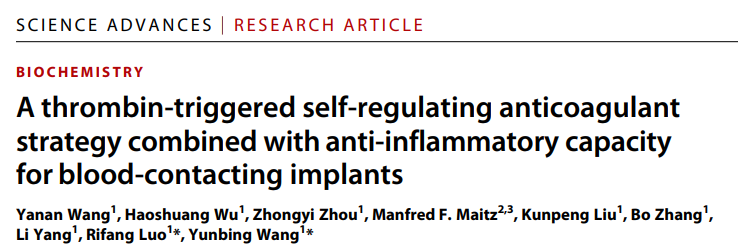 近期,国家生物医学材料工程技术研究中心王云兵教授团队,围绕心血管植介入器械植入后面临的组织反应为出发点,以内皮细胞表面血栓调节蛋白的自调节抗凝功能为灵感,结合材料植入后的全过程抗炎功能需求,提出了一种辅助心血管植介入材料表面再内皮化的新思路,即一种结合抗炎功能的凝血酶敏感自调节抗凝涂层改性新策略。在材料表面没有实现正常内皮覆盖的早期阶段,这种涂层有望代替并行使部分内皮细胞的血栓调节蛋白抗凝血功能,从而抑制材料早期剧烈的凝血反应,同时配合全过程的抗炎保护,为后续的器械表面再内皮化进程提供良好微环境保障。相关成果发表在国际知名综合性期刊Science Advances上(2022, 8, 9, eabm3378),国家生物医学材料工程技术研究中心/best365英国在线体育2019级博士研究生王雅楠为该论文第一作者,国家生物医学材料工程技术研究中心主任/best365英国在线体育院长王云兵教授、以及国家生物医学材料工程技术研究中心副研究员罗日方为该论文共同通讯作者。该论文工作同时还得到了德国莱布尼茨聚合物研究所Manfred F. Maitz博士的相关帮助。国家生物医学材料工程技术研究中心为该论文的唯一通讯单位。