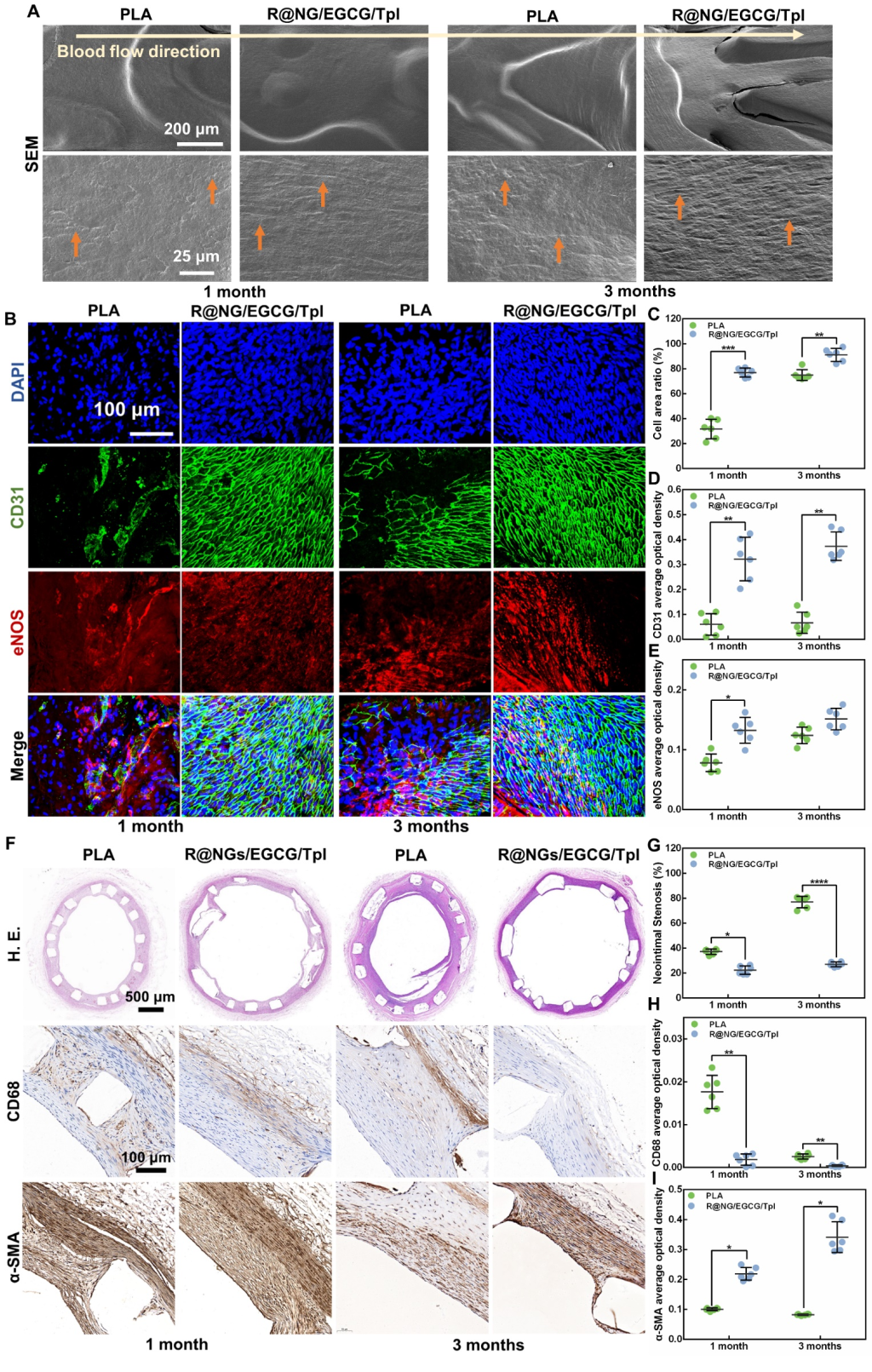 该涂层的抗凝功能由封装凝血酶抑制剂的凝血酶敏感纳米凝胶实现,纳米凝胶能够在环境凝血酶的刺激下释放抗凝药物,进而阻断凝血级联反应。超氧化物歧化酶模拟物Tempol与多酚类物质表没食子儿茶素没食子(EGCG)扮演协同抗氧化的角色,能够抵御自由基与炎症反应,克服单一抗氧化剂抗炎有限的劣势。本研究中,上述功能模块被巧妙的封装并制备成涂层,用于保护心血管材料,使用了两种典型的心血管植介入材料作为模型,即生物瓣膜和血管支架,验证了该涂层的有效性和多功能性(图1)。研究结果也表明,通过干预内皮化进程前期的组织反应来实现对后续内皮化的保护思路呈现了可行性和较大的潜力(图2)。本研究中的,依靠凝血酶响应来实现自调节精确抗凝血和炎症保护的新型功能涂层改性策略,能够抑制由于凝血和炎症反应引起的不良后果,为心血管植介入材料表面的再内皮化提供保驾护航的良好微环境,有望为材料学家设计仿生内皮的功能涂层提供新视角。