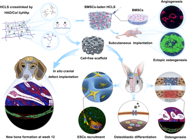 图1. HCLS通过募集和保留内源性干细胞快速启动成骨和成血管实现颅骨重建