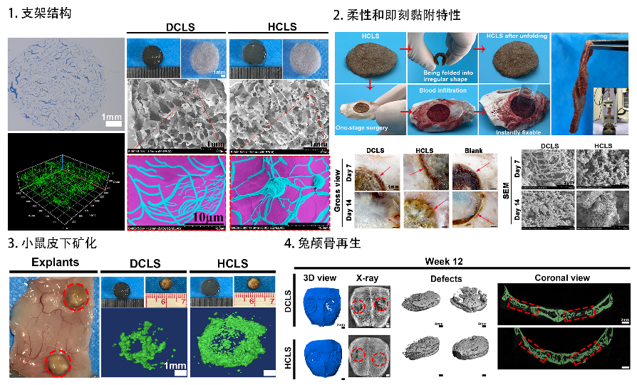 图2 HCLS通过组织粘附、钙离子螯合和柔性变形,实现良好的力学匹配与界面整合,引导颅骨再生