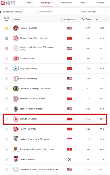 2022年7月19日,高等教育评价专业机构软科正式发布2022“软科世界一流学科排名”(ShanghaiRanking's Global Ranking of Academic Subjects),覆盖54个学科,涉及理学、工学、生命科学、医学和社会科学五大领域。四川大学生物医学工程学科获得215.3总分,较2021年上升3位,位列世界第10位。