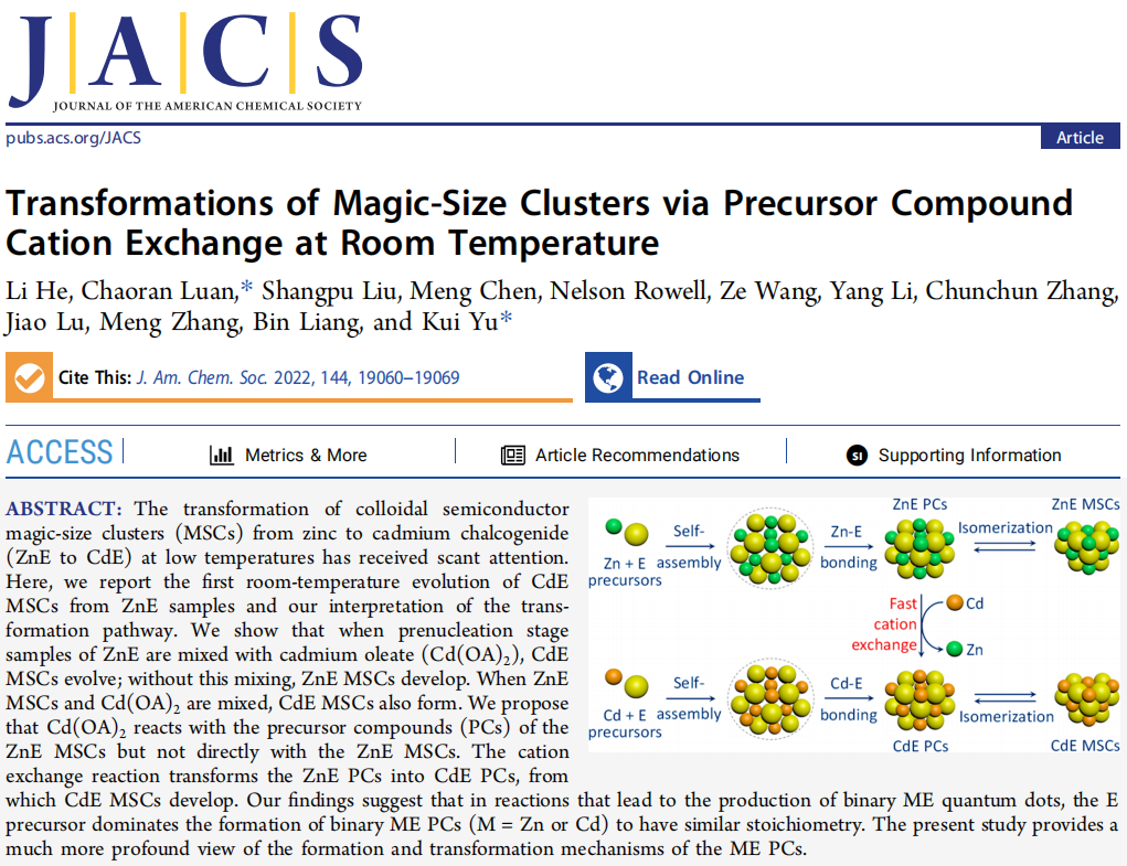 近日,国家生物医学材料工程技术研究中心/原子与分子物理所余睽教授团队长达五年的关于二元ZnE幻数团簇到CdE幻数团簇的室温阳离子交换的研究工作,在化学领域权威期刊J. Am. Chem. Soc杂志得到发表,题目为“Transformations of Magic-Size Clusters via Precursor Compound Cation Exchange at Room Temperature”。论文第一作者为国家生物医学材料工程技术研究中心博士生何丽,余睽教授和栾超然博士为论文共同通讯作者。四川大学系论文第一完成单位。