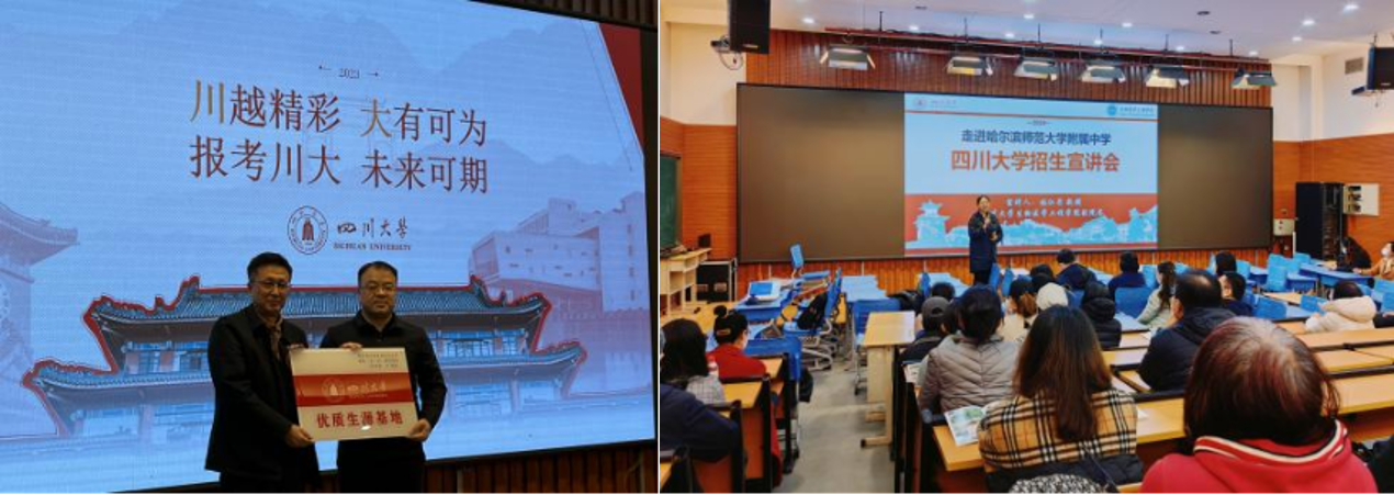 本次招生宣传有效增进了我校同黑龙江省多所中学的联系,进一步深化合作,共同推进人才培养,再增一批“四川大学优质生源基地”并举行了授牌仪式。通过各场次的交流与沟通,不仅加强了更多考生和家长对川大总体情况的了解,也帮助不同分数段的考生对是否选择川大以及如何选择川大各个专业有了更清晰的认识,为吸引黑龙江省更多优秀的同学未来能加盟川大打下了坚实的基础。