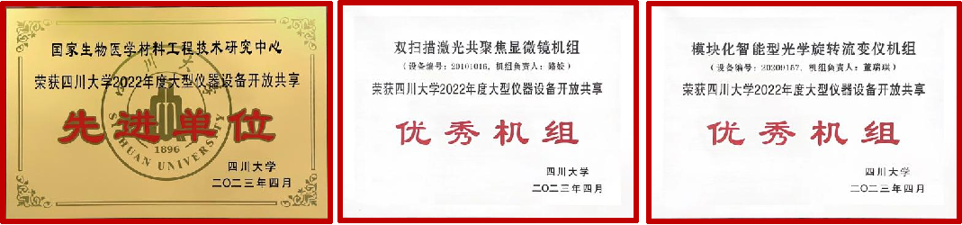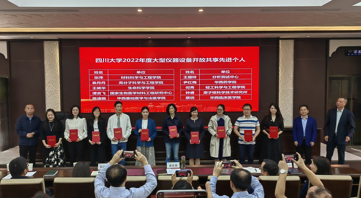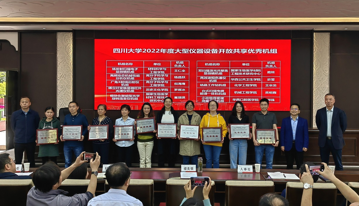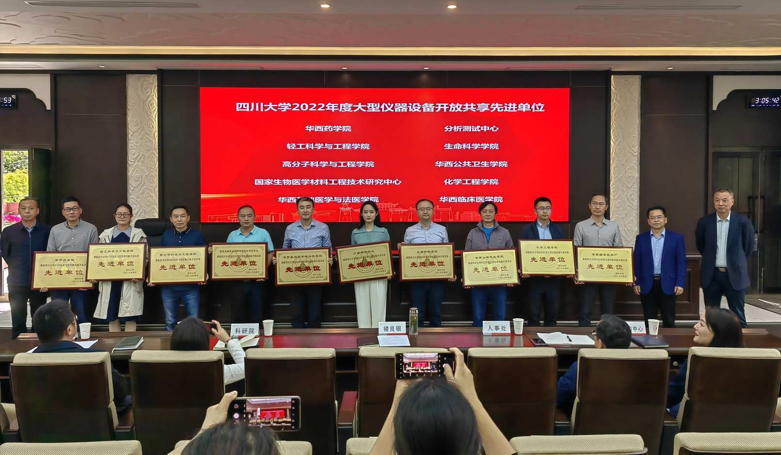 4月26日下午,学校在望江行政楼414会议室召开了“四川大学2023年度大型仪器设备开放共享工作推进会”,副校长褚良银出席会议并讲话。各学院、国家重点实验室、国家工程中心、研究所等二级单位分管领导、设备管理或大型仪器开放共享管理秘书、优秀机组负责人和先进个人获得者参加了会议。国家生物医学材料工程技术研究中心在四川大学2022年度大型仪器设备开放共享工作中成绩优异,荣获先进单位,双扫描激光共聚焦显微镜机组和模块化智能型光学旋转流变仪机组荣获优秀机组,谭言飞老师荣获先进个人。