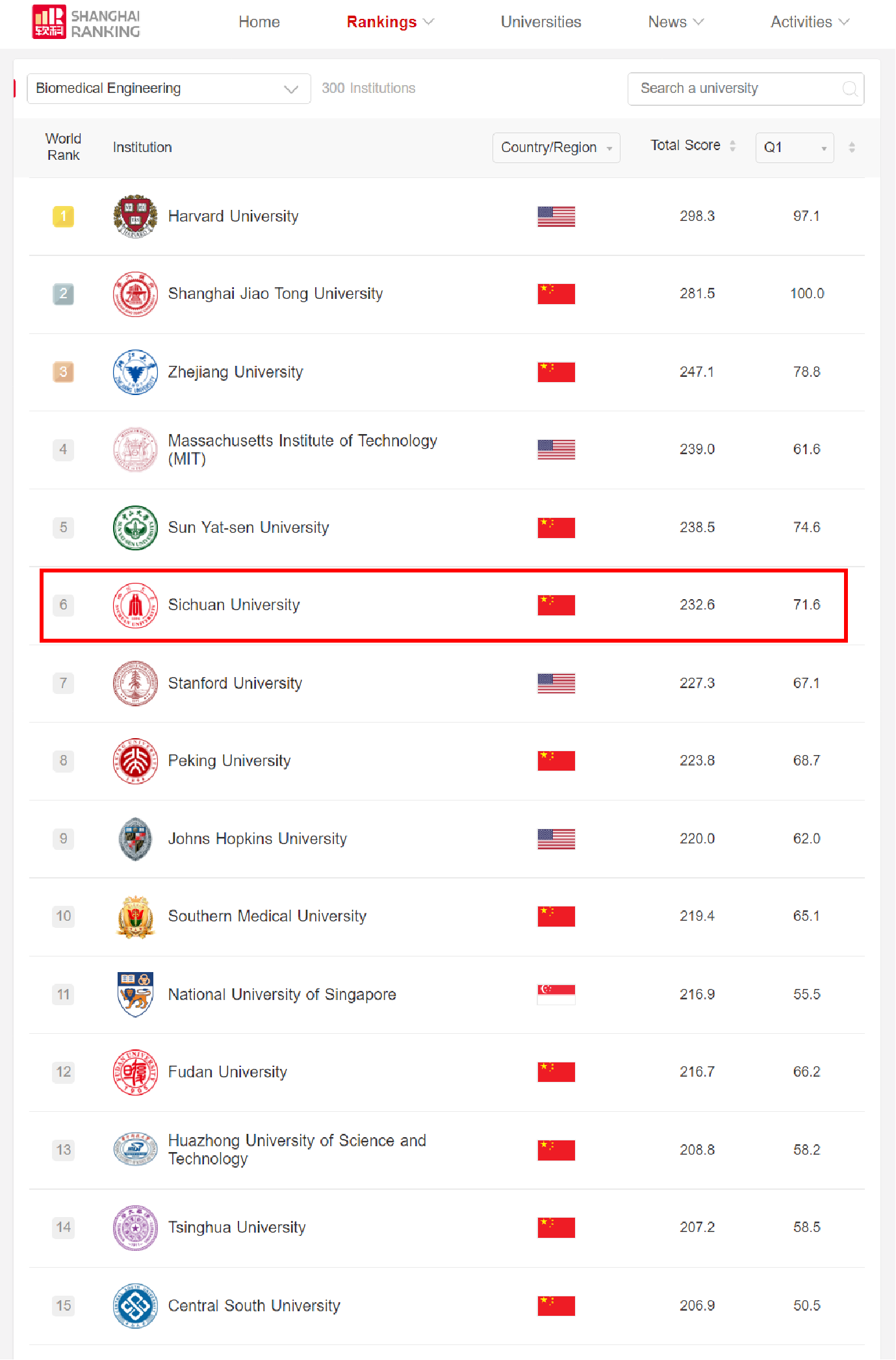 2023年10月27日,高等教育评价专业机构软科今日正式发布2023“软科世界一流学科排名”(ShanghaiRanking's Global Ranking of Academic Subjects)。2023年排名覆盖55个学科,涉及理学、工学、生命科学、医学和社会科学五大领域。四川大学生物医学工程学科获得232.6总分,较2022年上升4位,位列世界第6位。