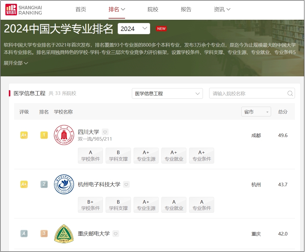 图1 2024软科中国医学信息工程专业排名前三的高校(来源于https://www.shanghairanking.cn/rankings/bcmr/2024/080711T/)