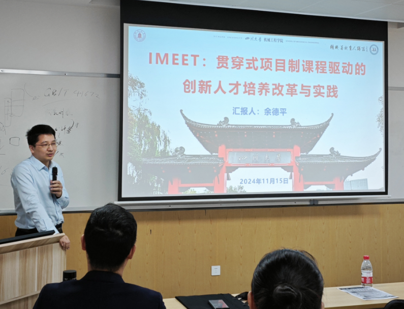 紧接着,余德平教授带来题为“IMEET: 贯穿式项目制课程驱动的创新人才培养改革与实践”的演讲。余教授从人才培养方案改革背景、项目制课程的理念与思路、改革的推进现状、改革面临的挑战及解决办法、总结与展望几个方面,系统地介绍机械工程学院项目制课程在创新人才培养中的情况,以及他们在这一领域的实践经验和成果。