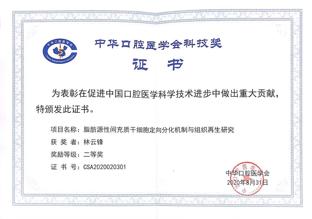831日,“2020中华口腔医学会科技奖”颁奖仪式在上海隆重举行。我院林云锋教授团队“脂肪源性间充质干细胞定向分化机制与组织再生研究”喜获二等奖。