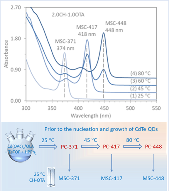 图1:CdTe QD成核前团簇的形成与异构化。当反应温度从25 °C升至 80°C, PC-371形成并逐步异构化为PC-417与PC-448。相应的样品分散在室温CH和OTA混合溶剂中,紫外-可见吸收仪监测到MSC-371、MSC-417和MSC-448。