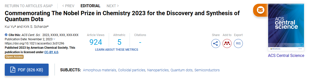 近日,国家生物医学材料工程研究中心/原子与分子物理所余睽教授,受Carolyn R. Bertozzi教授(2022年诺贝尔化学奖得主)邀请,和Kirk S. Schanze教授(ACS Appl. Mater. Interfaces主编)在ACS Cent. Sci. 发表题为“Commemorating The Nobel Prize in Chemistry 2023 for the Discovery and Synthesis of Quantum Dots”评述文章,以致敬2023年诺贝尔化学奖“量子点的发现和合成”。