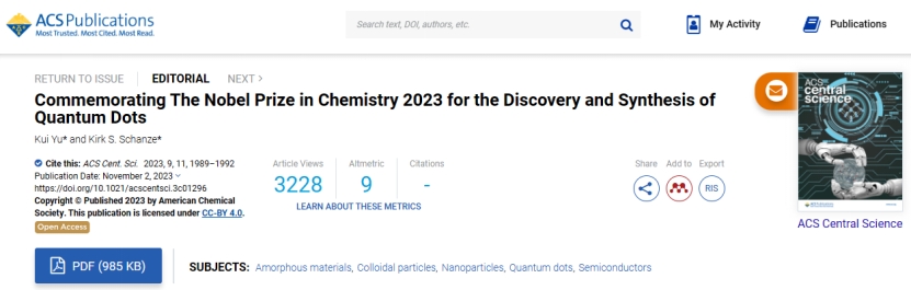 我院余睽教授应2022年诺贝尔化学奖“点击化学和生物正交化学”获得者Carolyn R. Bertozzi邀请,和Kirk S. Schanze教授(ACS Appl. Mater. Interfaces主编)于2023年在美国化学会期刊ACS CentralScience上发表专文“Commemorating The Nobel Prize in Chemistry2023 for the Discovery and Synthesis ofQuantum Dots”,介绍2023年诺贝尔化学奖量子点的发现和合成(ACS Cent. Sci.2023,9, 1989−1992)。