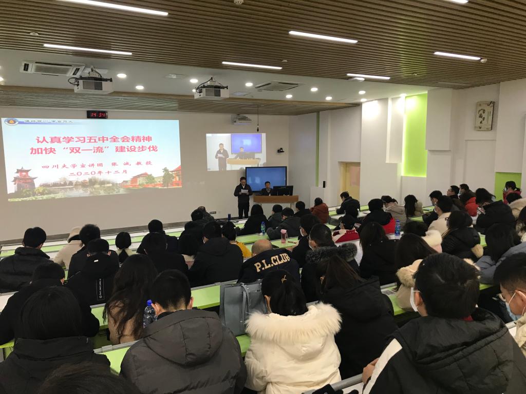 为深刻理解和贯彻落实党的十九届五中全会精神,best365英国在线体育党委于12月18日下午在望江校区基础教学楼C座204教室举行“党的十九届五中全会精神宣讲报告会”,院党委书记尹光福教授主持,特邀学校宣讲团专家张诚教授主讲,学院领导班子成员和师生党员近200人参加了宣讲报告会。