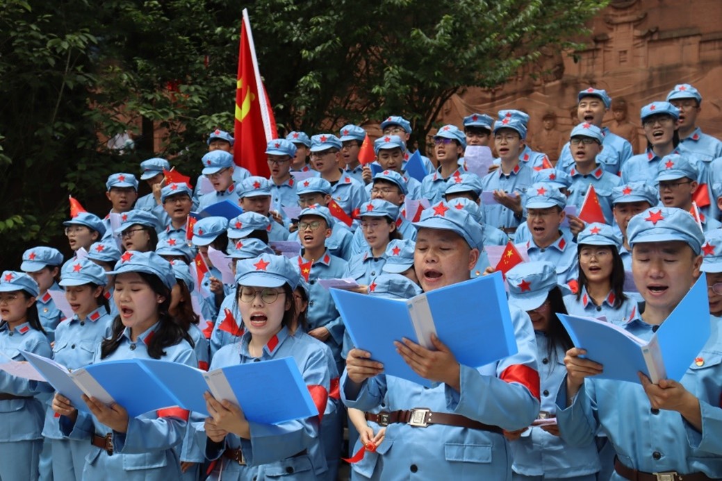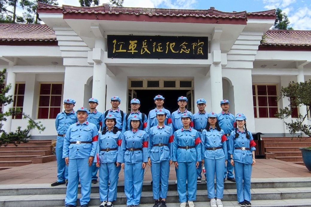 全体师生身着红军衣,头戴红军帽,在优秀研究生党员学长、2018级博士研究生龙仕和同志的引导下,整队前往红军长征纪念馆。