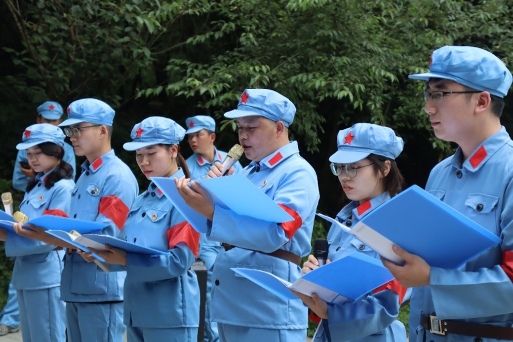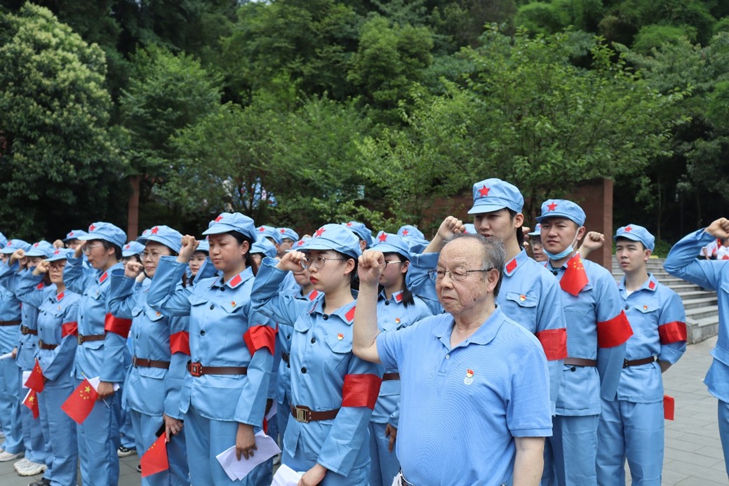 面向红军长征纪念碑,全体师生脱下军帽,敬献花篮并集体默哀,缅怀革命先烈,赓续共产党人的精神血脉。在张兴栋院士的带领下,全体党员面向党旗,重温入党誓词。