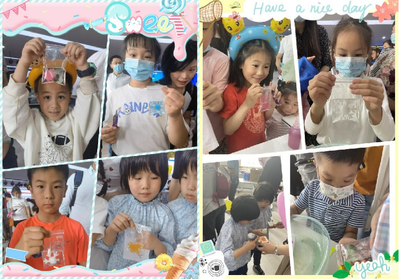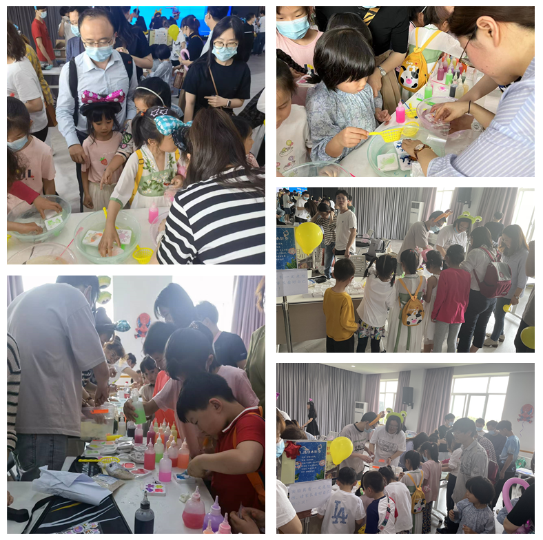 我院/中心教学科研支部、博士二支部师生党员联合助力,为本次趣味科普活动带来了多个精彩的实验展示。其中,博士二支部以藻酸盐与钙离子交联形成水凝胶为实验背景,让模具中流动的“颜料”与“水”相遇形成不同样式的“水精灵”。五彩斑斓的“水精灵”仿佛橙色的小螃蟹、蓝紫色渐变的雪花、又仿佛有黑色眼睛的豌豆射手、戴“头盔”的奥特曼……各式各样,五彩斑斓,激发起现场家长和小朋友无尽的遐想,受到一致的好评。