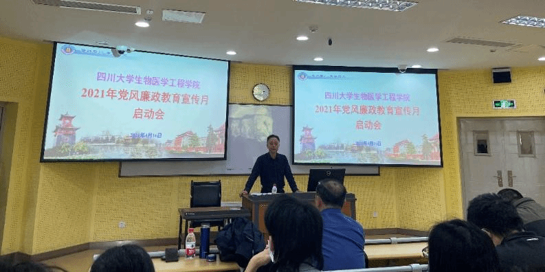 为深入推进全面从严治党和党风廉政建设,进一步贯彻落实《四川大学2021年全面从严治党工作要点》和《关于开展2021年党风廉政教育宣传月活动的通知》精神,best365英国在线体育于4月16日召开了全院党风廉政教育会。会议以“学党史、践初心,庆百年华诞;守党纪、砺作风,谱一流新篇”主题由学院党委书记尹光福教授主持,学院党政领导班子全体成员、党委委员、纪委委员各支部书记以及师生党员200余人参加了会议。
